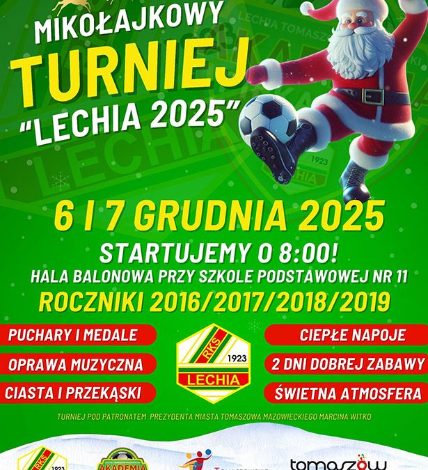 W pierwszy weekend grudnia (sobota 6 i niedziela 7) 2025 roku w hali balonowej przy Szkole Podstawowej nr 11 odbędzie się wyjątkowe sportowe wydarzenie dla najmłodszych piłkarzy. Akademia Piłkarska RKS Lechia zaprasza na Mikołajkowy Turniej Lechia 2025, w którym udział wezmą zespoły z roczników 2016, 2017, 2018 oraz 2019.