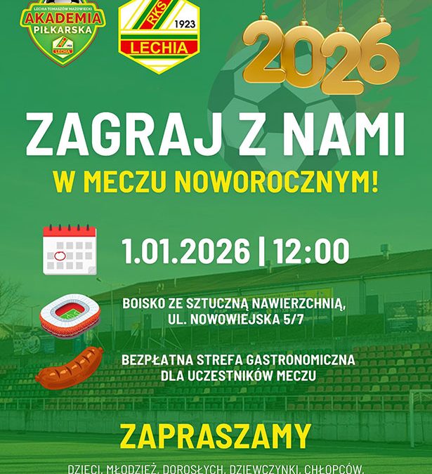 Akademia Piłkarska RKS Lechia po raz kolejny zaprasza wszystkich sympatyków futbolu do udziału w Meczu Noworocznym, który odbędzie się 1 stycznia 2026 roku o godzinie 12:00 na boisku ze sztuczną nawierzchnią przy ul. Nowowiejskiej 5/7. Wydarzenie ma charakter otwarty. Udział może wziąć każdy, niezależnie od wieku, płci czy piłkarskiego doświadczenia.